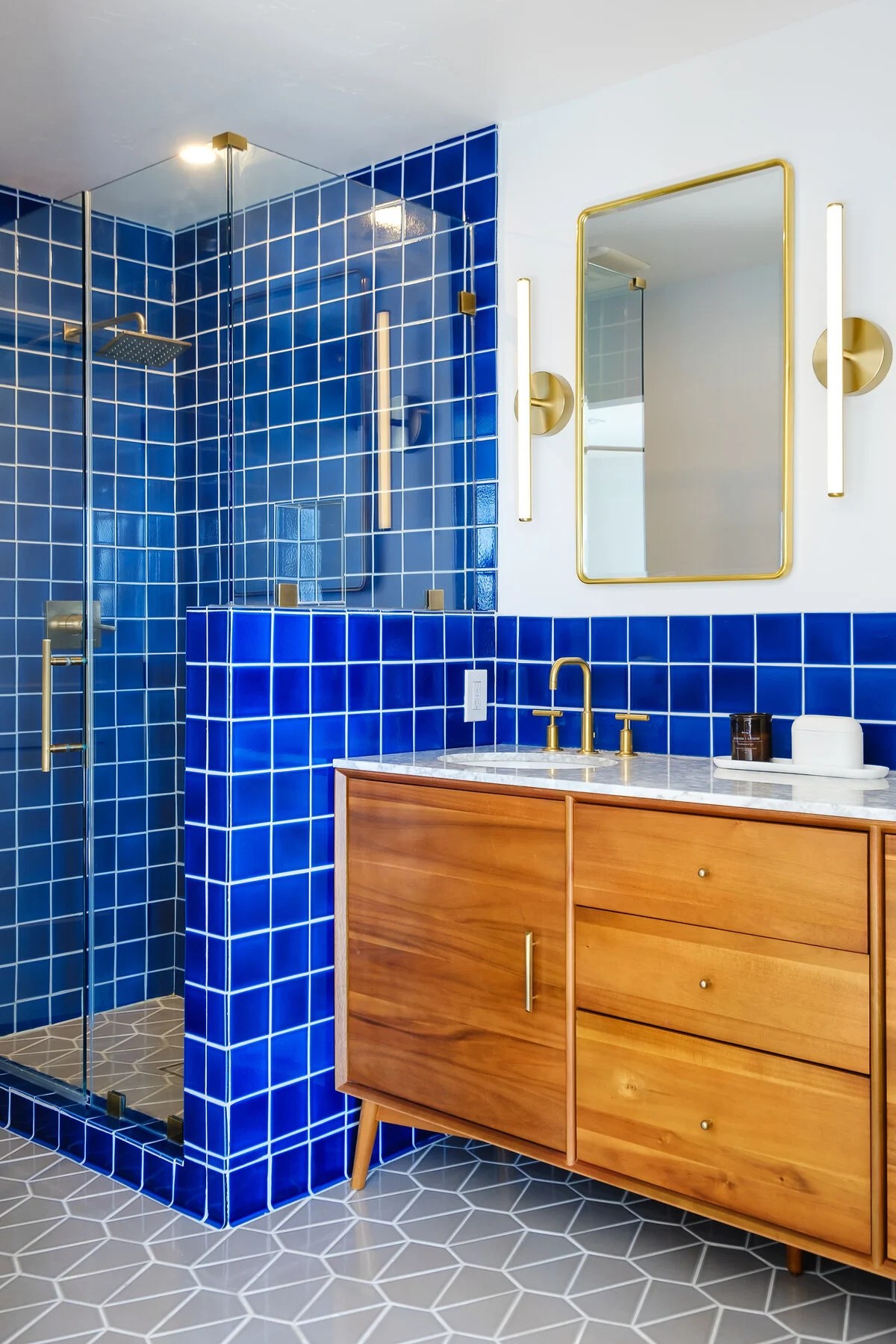 25 Blue Bathrooms That Really Inspire Shelterness Subway Tile Bathroom Blue Combining vibrant blue shades with new and exciting shapes such as hexagons, 3d subway tiles, and printed textures brings an exciting. If you’re looking to add a calming pop of color to your kitchen, bathroom, or pool, these gorgeous blue subway tiles are perfect. They are affordable, work with styles from traditional to farmhouse to modern, and are neutral enough. Subway Tile Bathroom Blue.