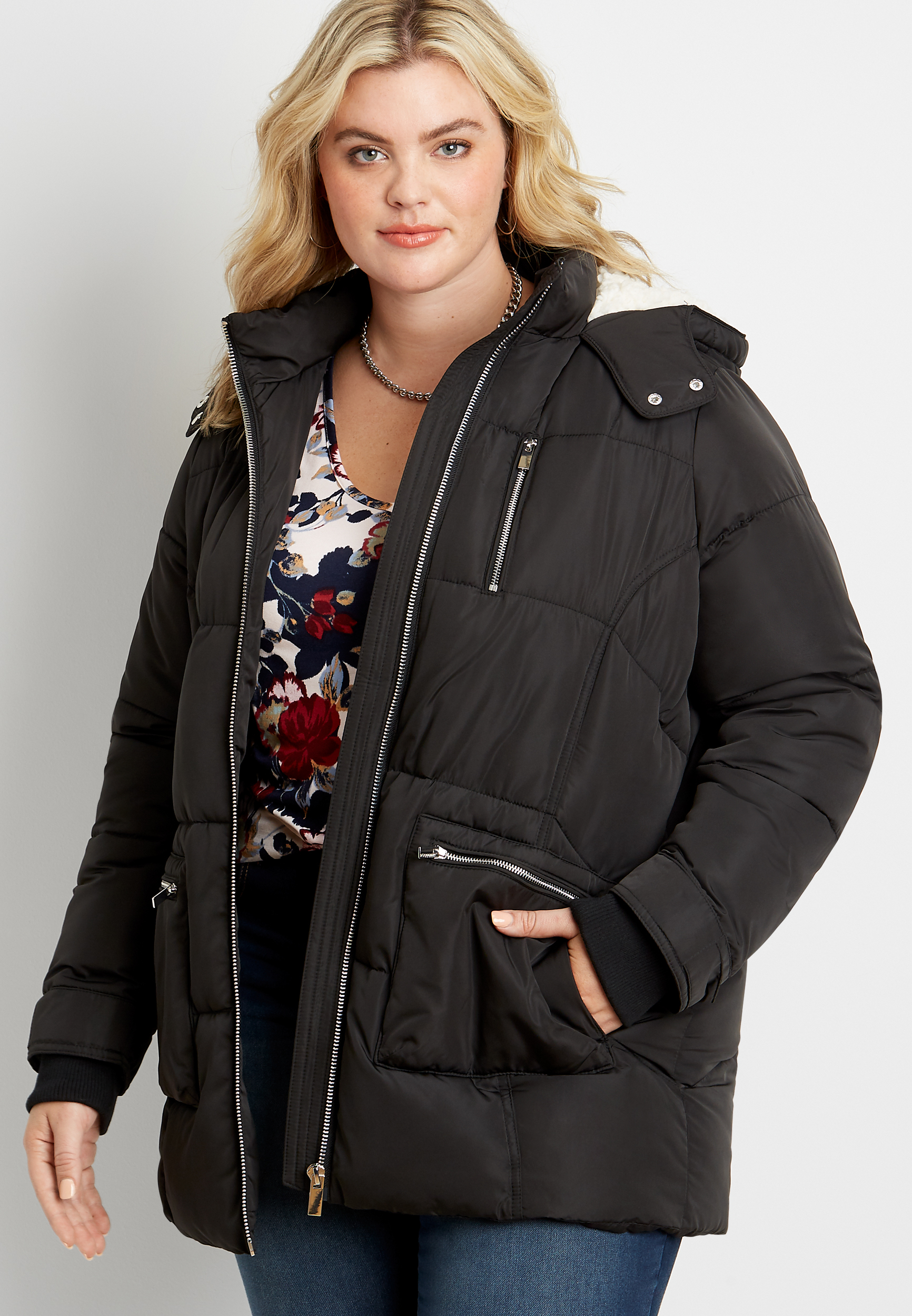 Plus Size Black Sherpa Lined Hooded Puffer Outerwear Jacket maurices
