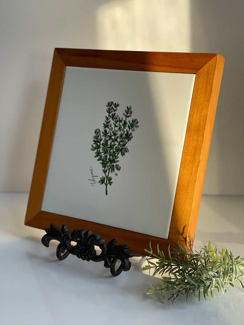 Vintage Tile Thyme Wall Art / Table Decor With Solid Wood Frame Nice & Heavy Stand NOT Included