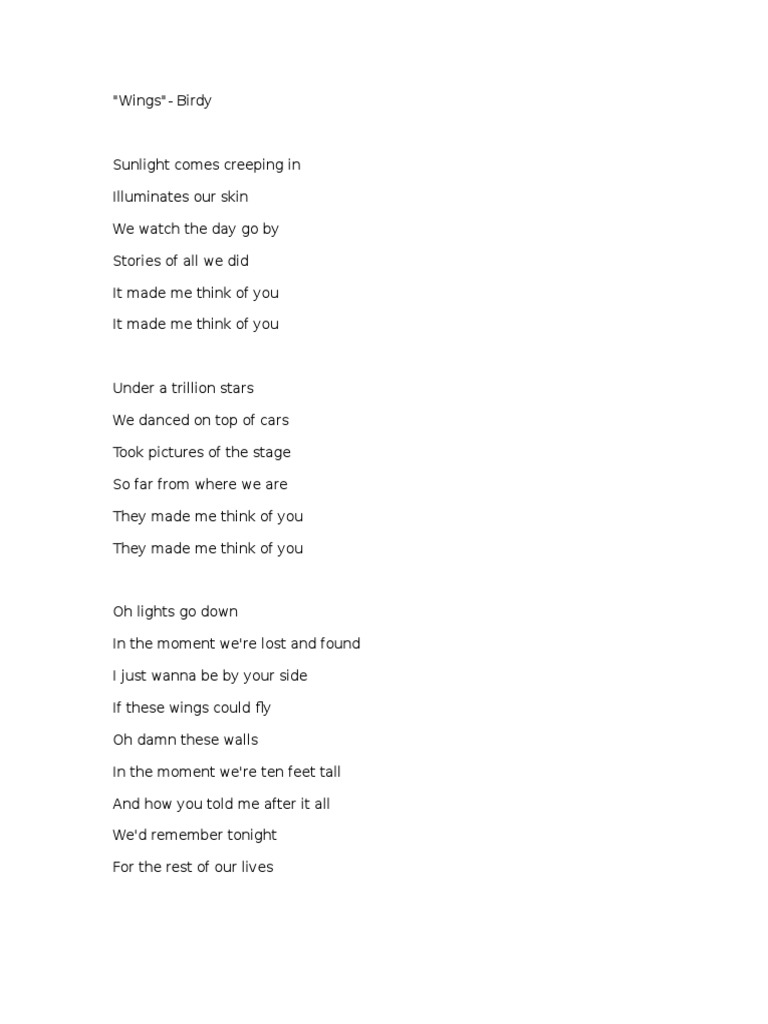 Wings // Birdy Lyric quotes, Lyrics, Song quotes Birdy Wings Lyrics Genius Under a trillion stars / we danced on top of cars / took pictures of the stage / so far from. Stories of all we did. Stories of all we did. Sunlight comes creepin' in / illuminates our skin / we watched the day go by / stories of all we did /. The lyrics include the phrase it made. Birdy Wings Lyrics Genius.
