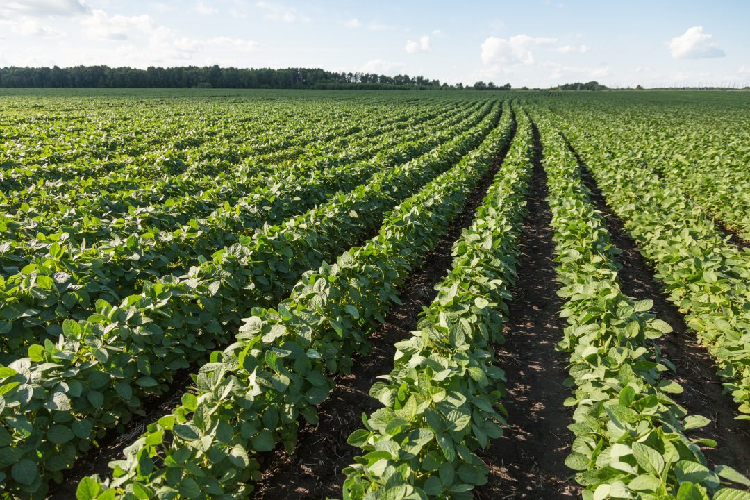 Rows of young soybean plants Maryland Soybean Board