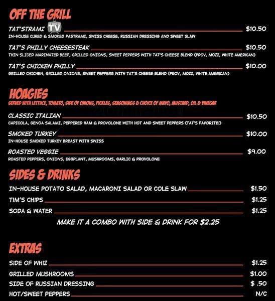 Online Menu of Tats Pizzeria Restaurant, Zanesville, Ohio, 43701 Zmenu Tats Food Truck Menu tat’s truck brings forward classic food truck sandwiches that are served on freshly baked italian rolls! See 302 unbiased reviews of tat's deli, rated 4.5 of 5 on tripadvisor and ranked #10 of 2,569 restaurants in seattle. They offer a complete range of off the grill. Want to place an order or know where we're at? welcome to. Tats Food Truck Menu.