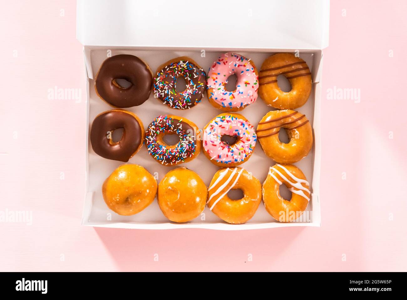 Flat lay. Variety of storebought doughnuts in a white paper box Stock