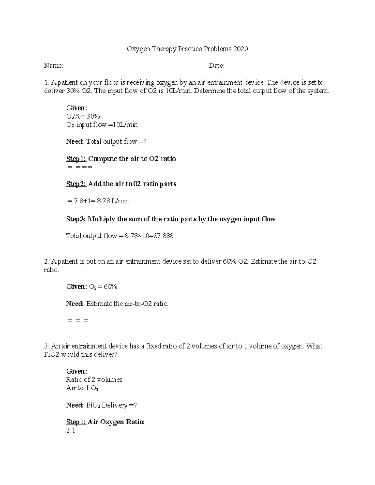 Oxygen Therapy Problems 2020 Oxygen Therapy Practice Problems 2020