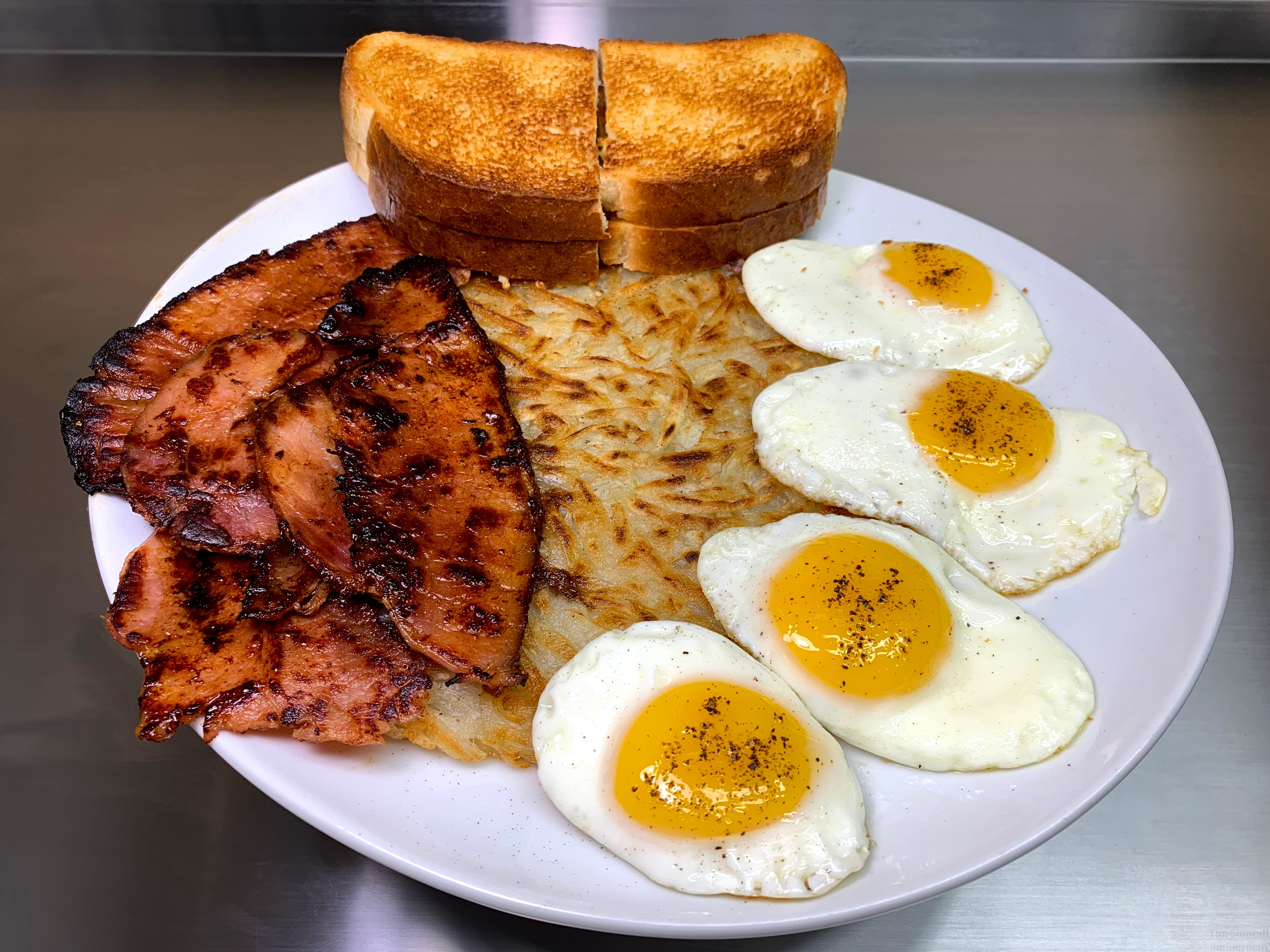 Fried Smoked Spiral Ham with Redeye Gravy, Eggs, Hash Browns and