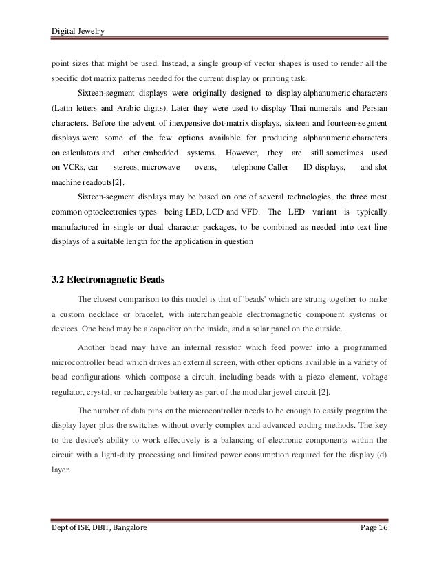 Final digital jewelry report Digital Jewellery Seminar Report The combination of microcomputer devices and increasing computer power has allowed several companies to begin producing fashion jewelry with embedded intelligence i.,. 1) a report on digital jewelry which are fashion accessories that can store. This document is a seminar report on digital jewelry that was submitted to fulfill degree requirements. This document discusses digital jewelry, which embeds computing components. Digital Jewellery Seminar Report.