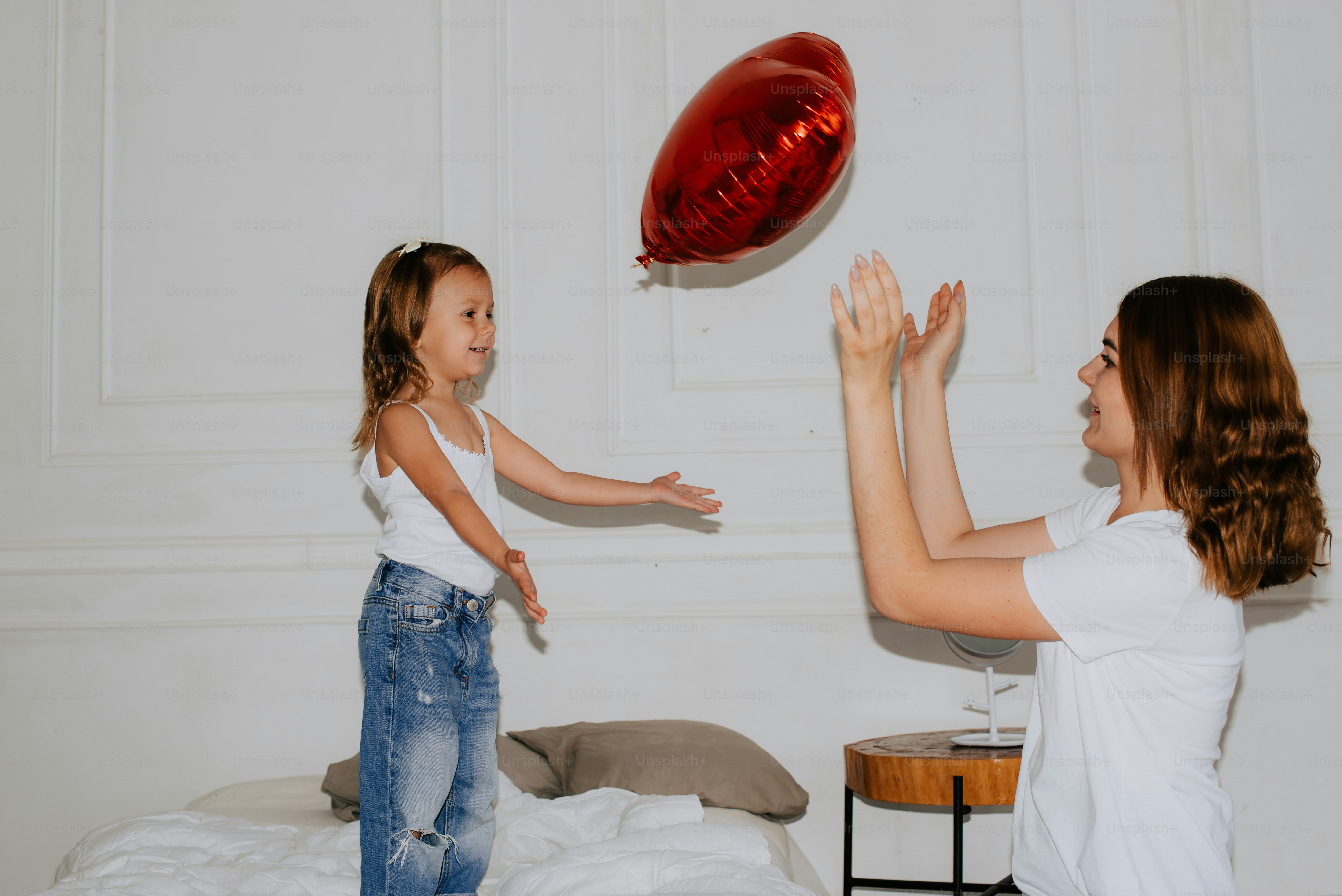 A woman holding a little girl up to a red balloon photo Parenting