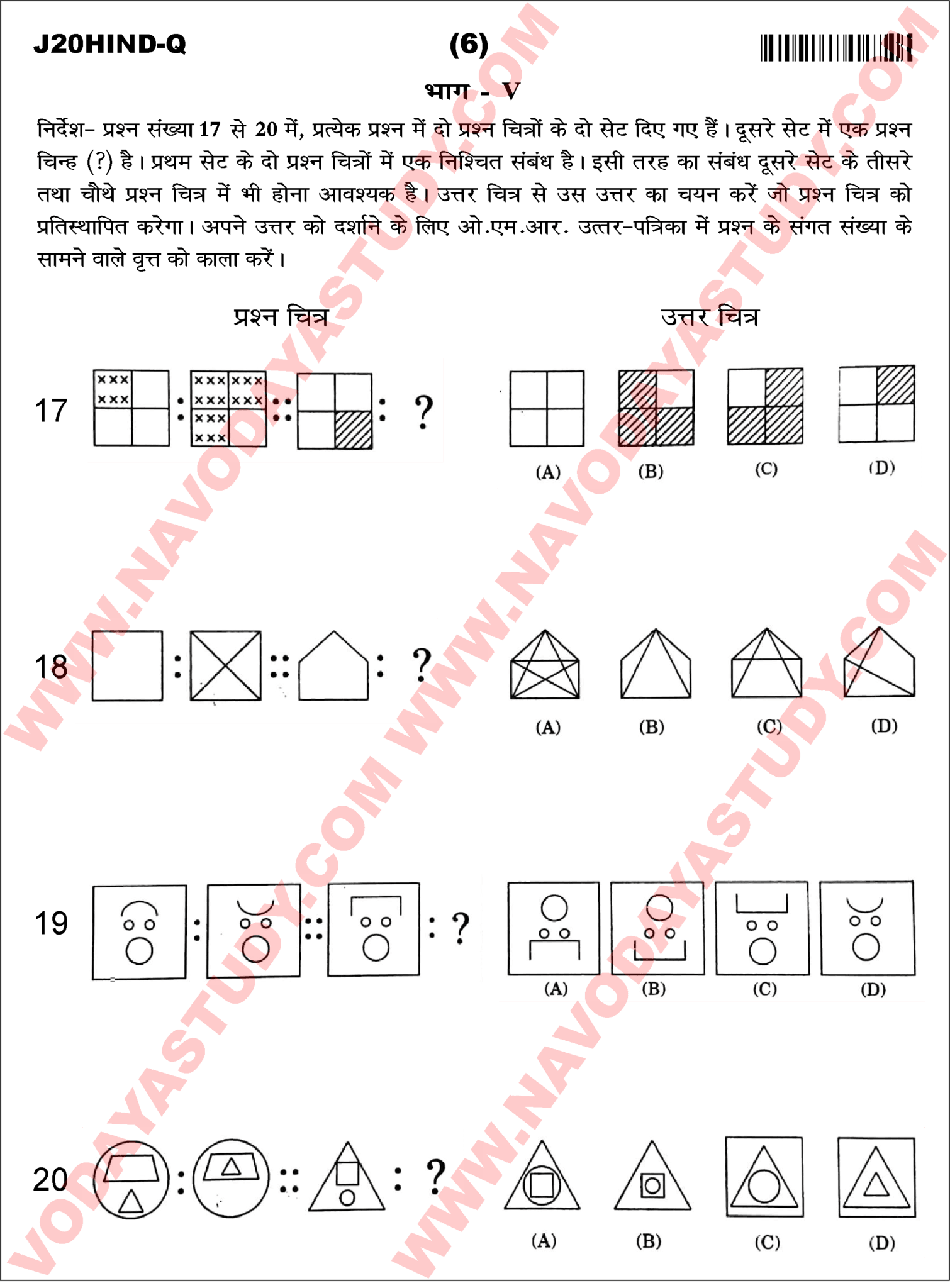 Navodaya Previous Year Question Paper J20 HIND 2020 1st Phase for Class