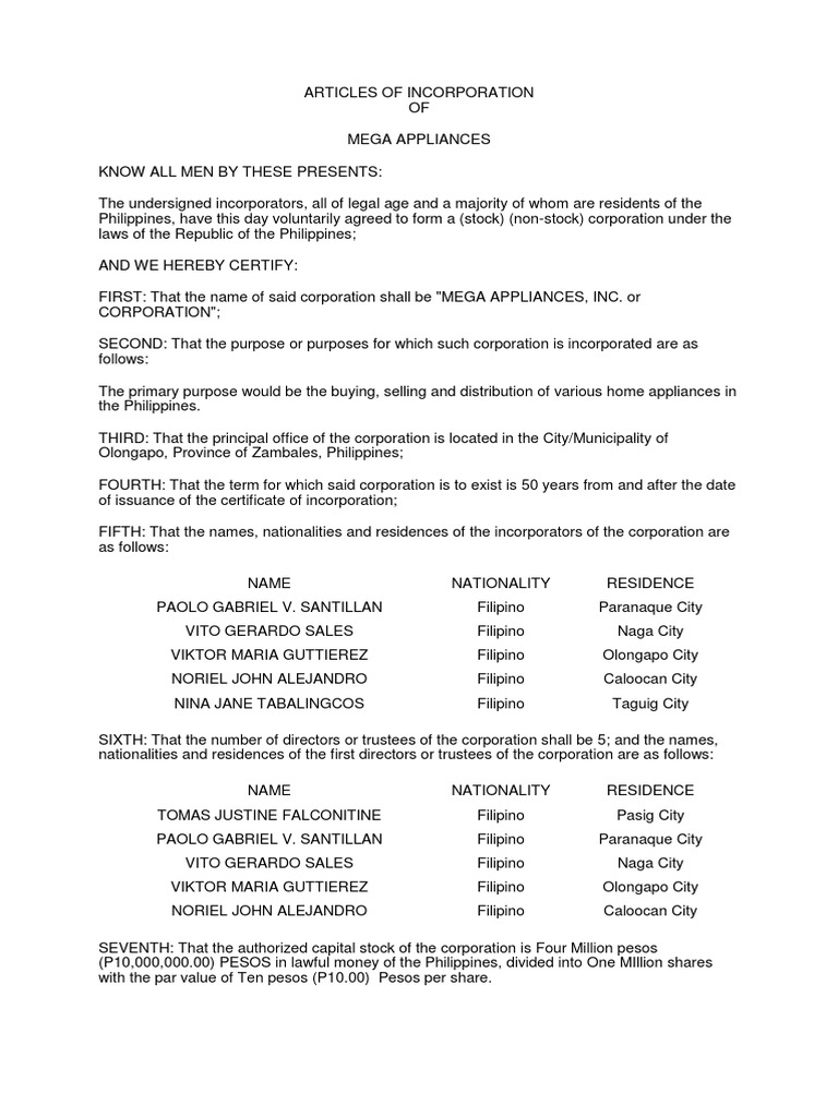 Articles of Incorporation Sample PDF Corporations Subscription