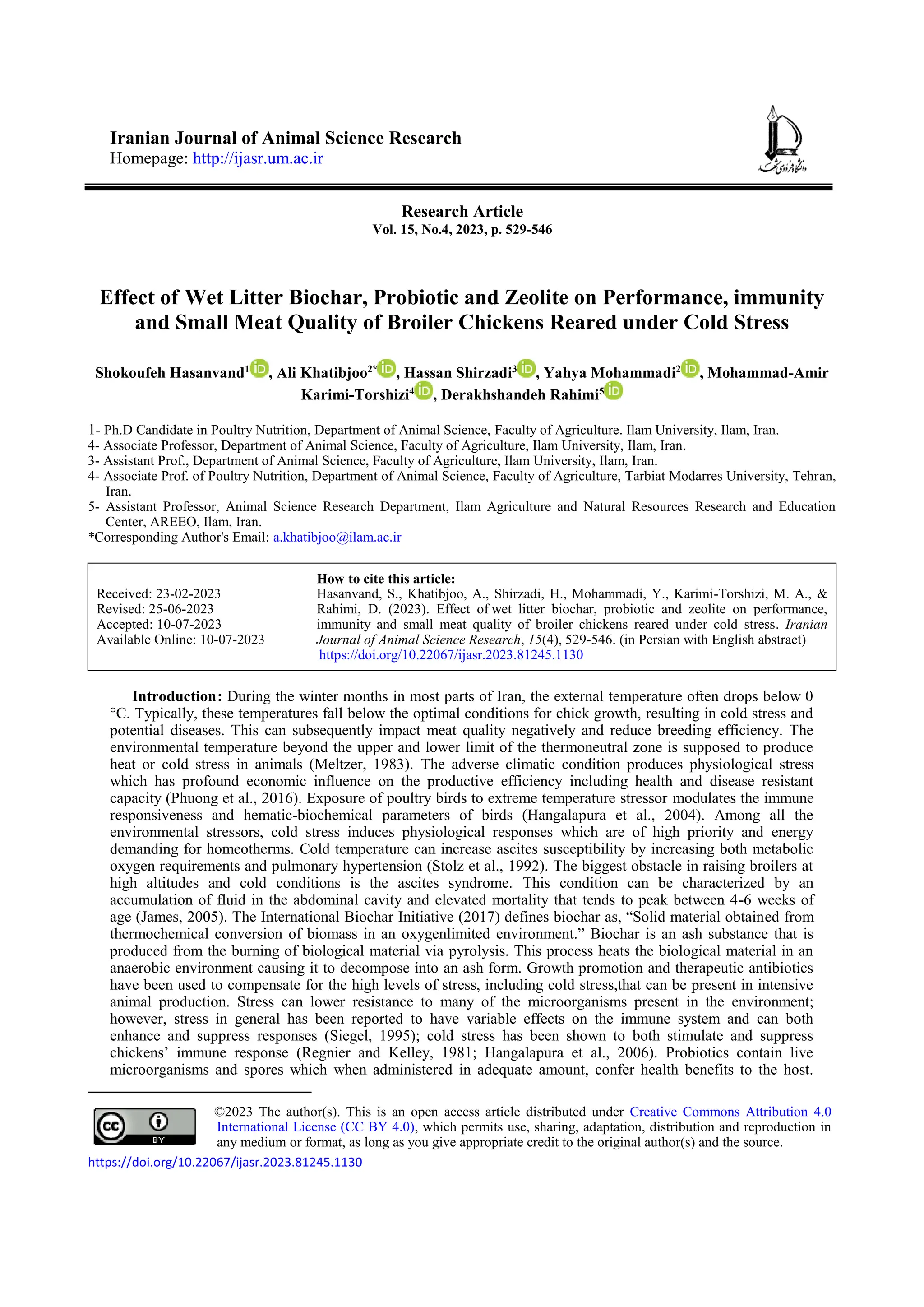 Effect of Wet Litter Biochar, Probiotic and Zeolite on Performance