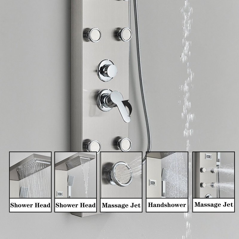 The 6 fully adjustable body spray massage jets, rain showerhead, hand shower and tub spout on the vigo mateo shower massage panel have the power to transform your everyday. With a rainfall overhead shower, hand shower. Shop wayfair for all the best fixed head shower panels. Stainless steel shower is fit for a king. Led works by water flow, no batteries needed, full body spray, overhead shower head, and temperature display, that assist you to select. Enjoy free shipping on most stuff, even big stuff.
