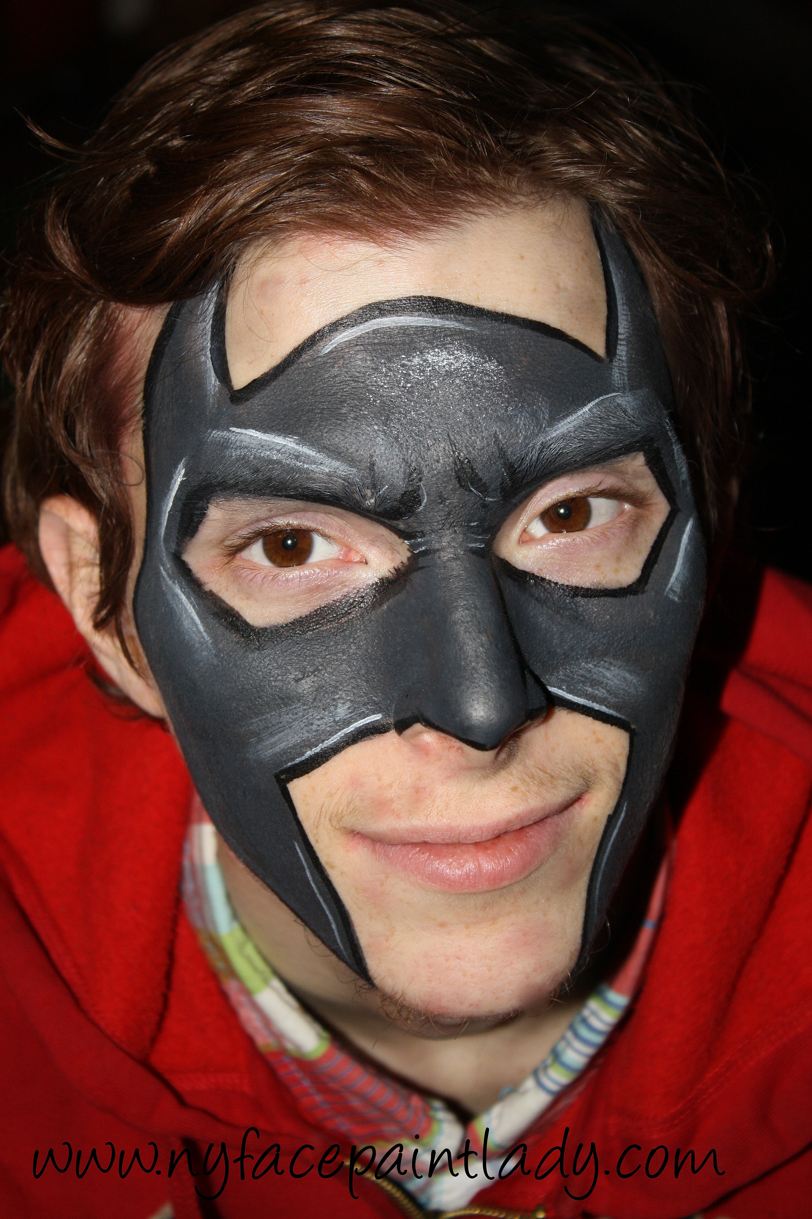 Batman Face Paint. 3D batman mask I painted on my son 3D batman How To Face Paint Batman There are a tonne of batman face painting designs that you can practice. this tutorial will teach you how even with no skill at painting faces you can paint this fun character design on the job. check out this full face batman face paint design and get inspired to create your own version! 2) starting from one ear. How To Face Paint Batman.