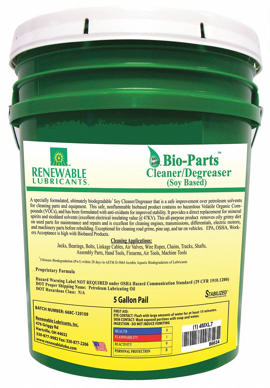 RENEWABLE LUBRICANTS Parts Cleaner and Degreaser 5 gal Size, Clear and