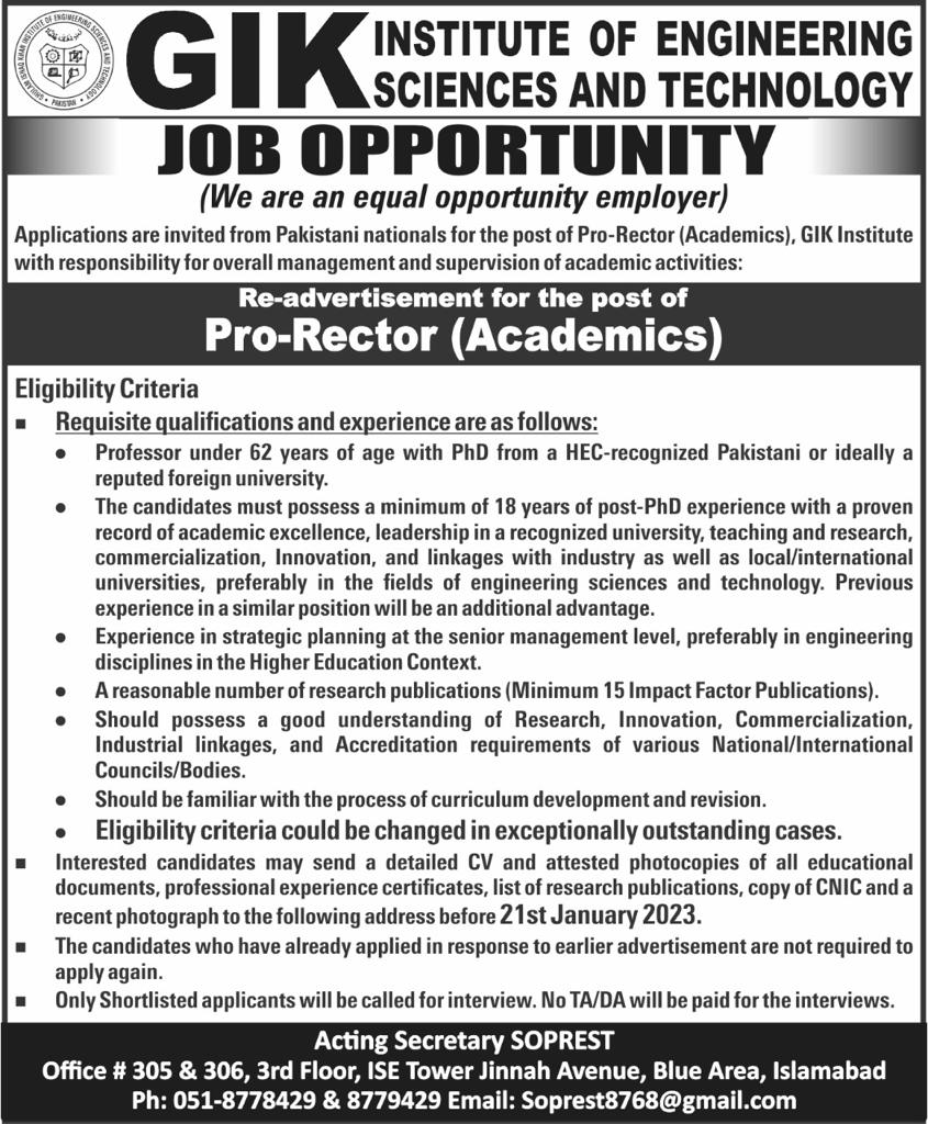 Job Opportunity ProRector (Academics) Ghulam Ishaq Khan Institute