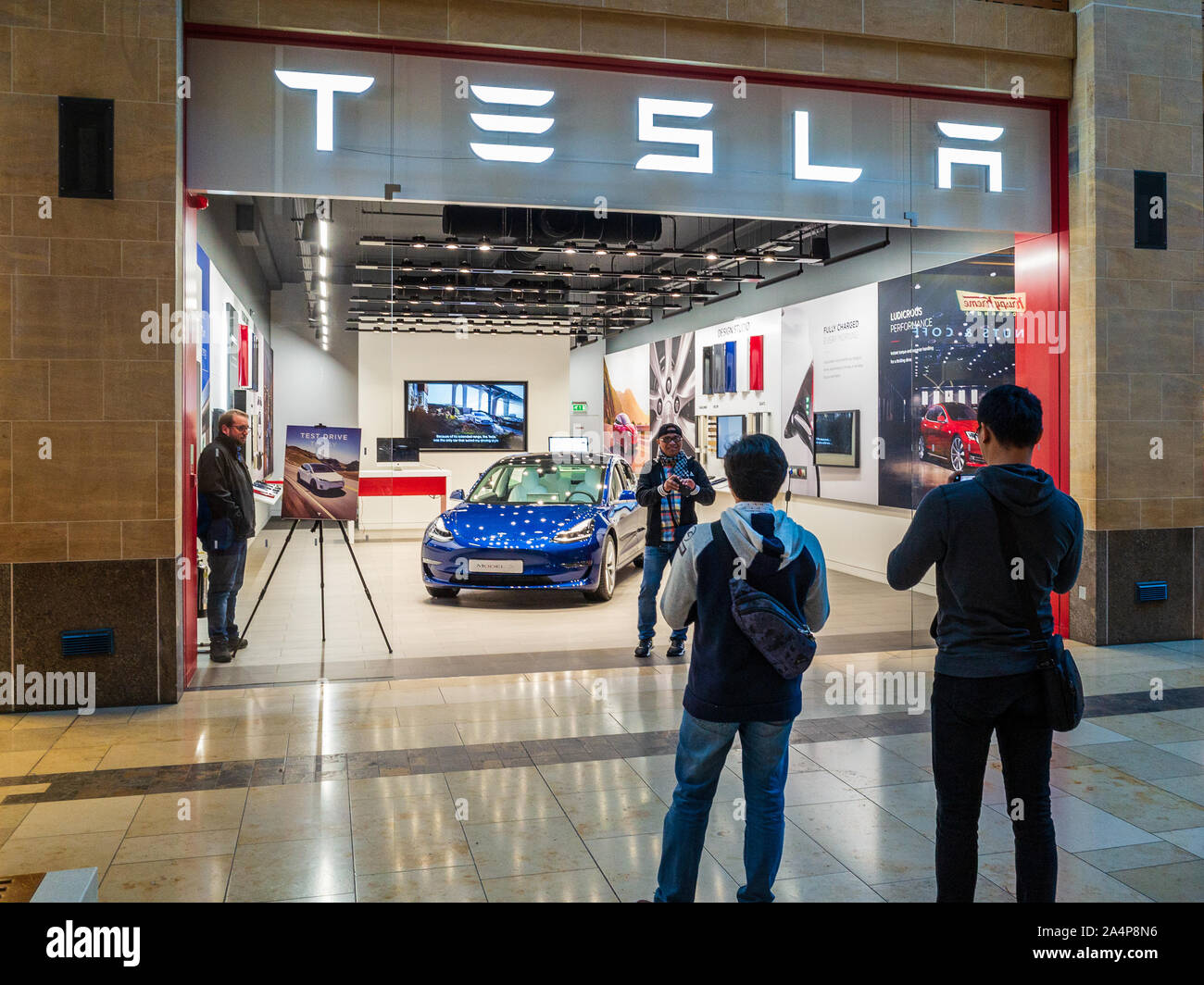 Tesla Showroom Tourists take photos in front of the Tesla Model 3 car