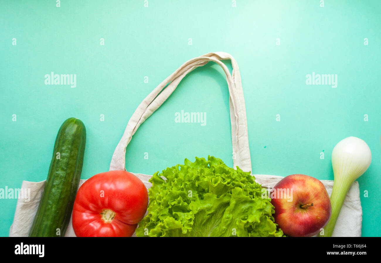 Fresh fruits and vegetables in eco bag on turquoise background with