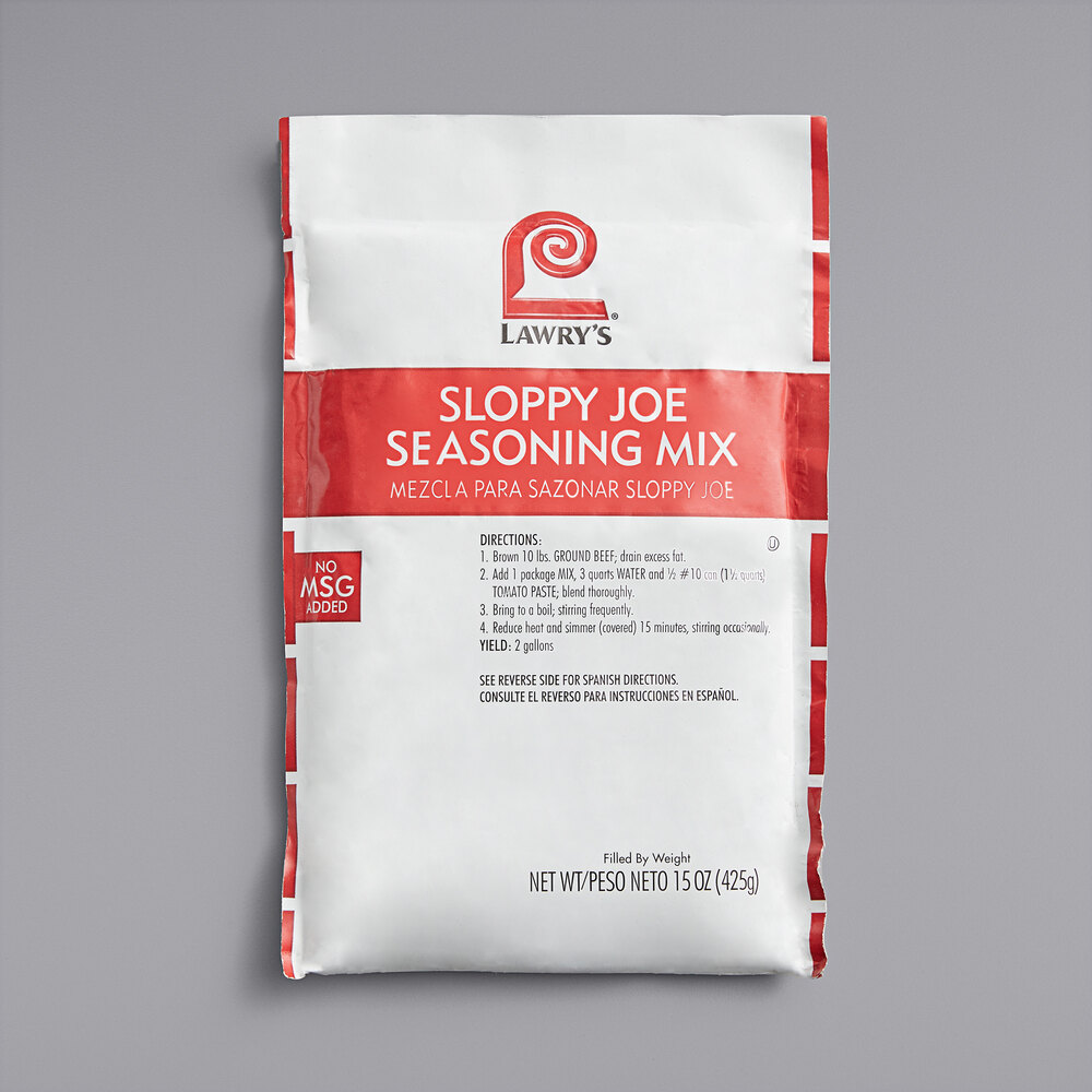 Lawry's 15 oz. Sloppy Joe Seasoning Mix 6/Case Lawry's Sloppy Joe Mix Recipe Our blend of paprika, chili pepper & garlic adds flavor right where it needs to be, no matter how sloppy the joe. Use in ground beef or chili to create the perfect sloppy joe for your menu. Just add tomato sauce, tomato paste, and water to create flavorful sloppy joes. Make a big batch so you never run out. 1. Lawry's Sloppy Joe Mix Recipe.