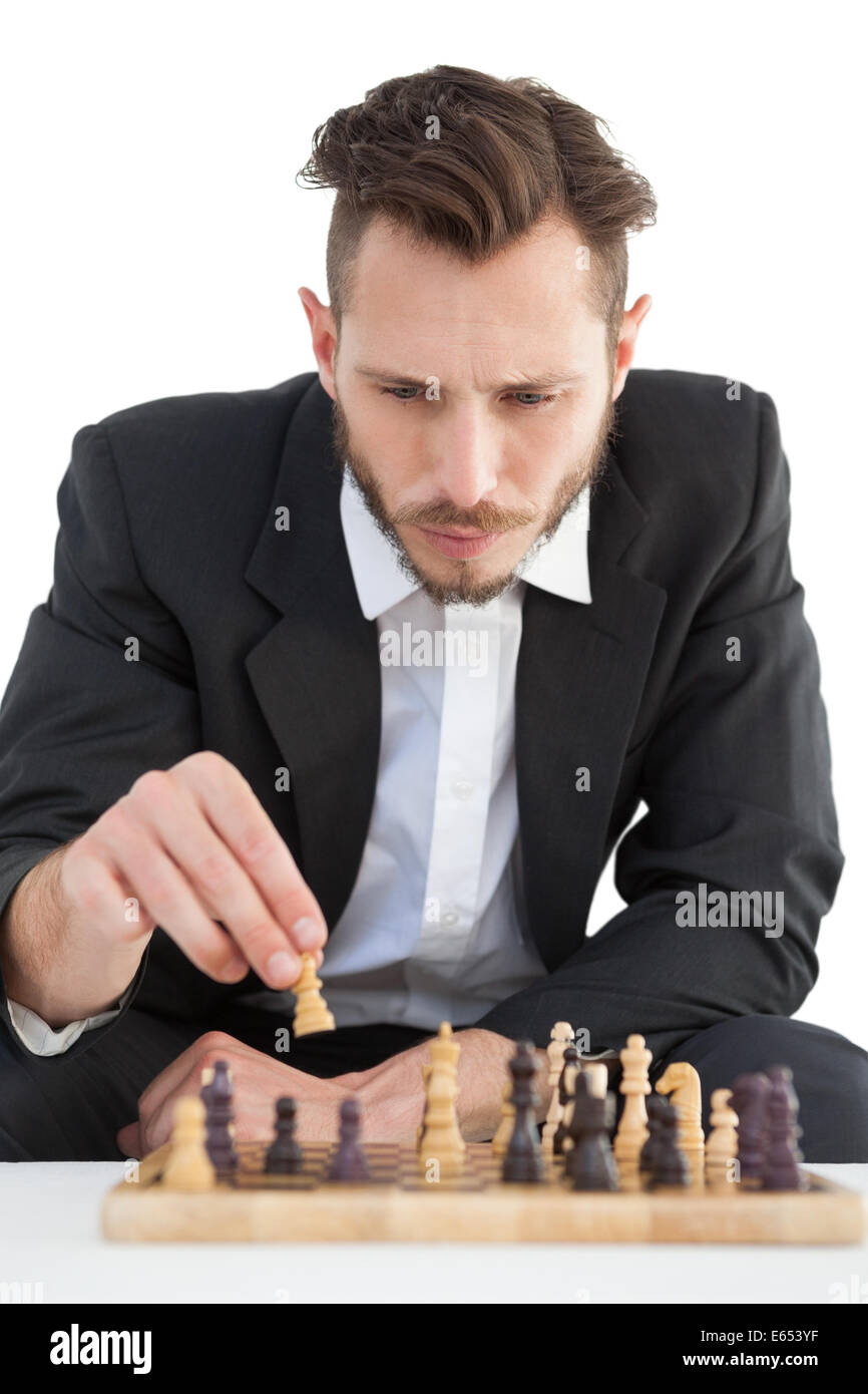 Focused businessman playing chess solo Stock Photo Alamy