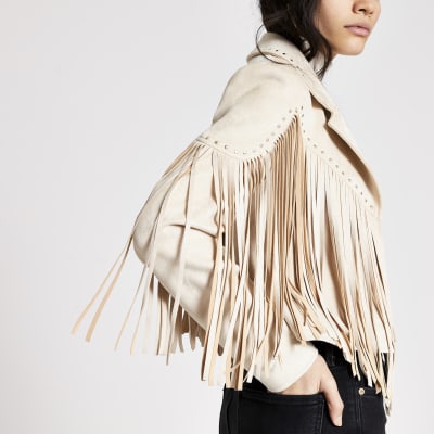Cream suedette fringe studded jacket River Island