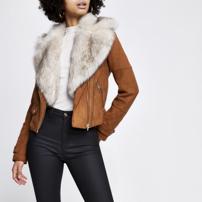 Brown faux fur biker jacket River Island