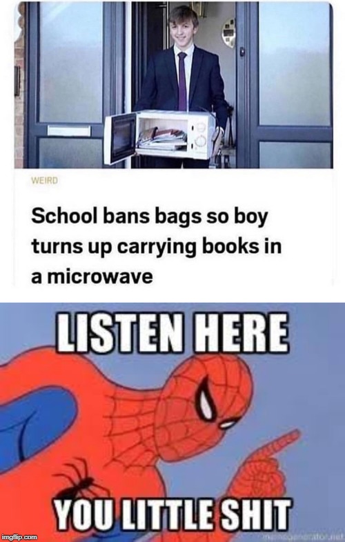 School ban bags Imgflip School Bans Bags Microwave But one school in lincolnshire took this unusual step because. Protested his school’s “ridiculous” ban on bags by taking his books. A sixth form has banned students from bringing bags to lessons after claiming they are injuring younger pupils. A school has banned bags for health and safety reasons leading some pupils to get creative with how they carry their. School Bans Bags Microwave.