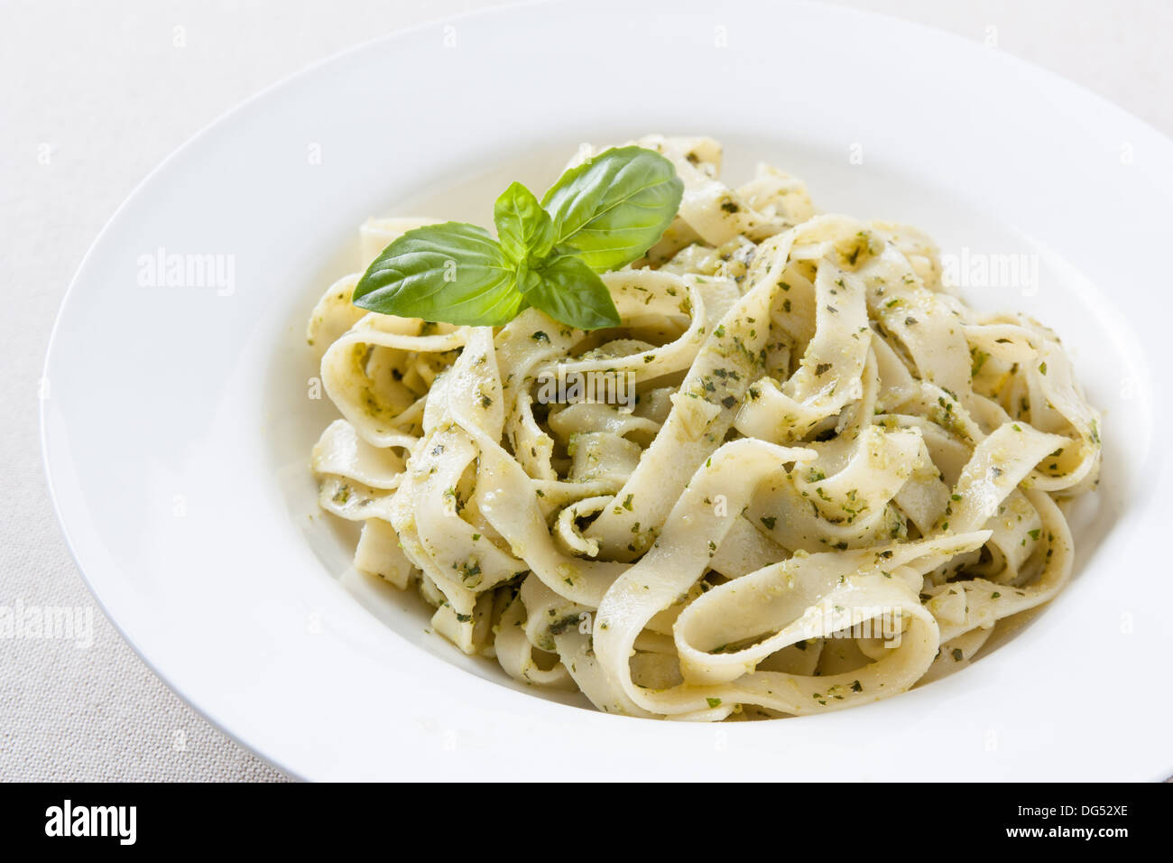 Plate of fettuccine al pesto with basil leaves Stock Photo Alamy