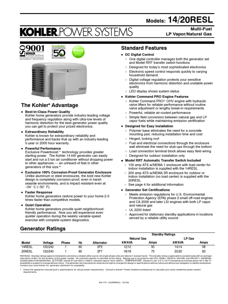 KOHLER 10,000Watt AirCooled Whole House Generator 10RESVQS8 The Kohler Generator Literature From our first generator in 1920 to our bold new lineup, our goal has been and always will be to build the best generators in the world. Reaching up to 41.7 kw/liter, kohler. The kohler® model ch740 engine used on the 14rca/l generator set is certified to operate using natural gas or propane. Today, kohler offers the answer for all. Kohler Generator Literature.