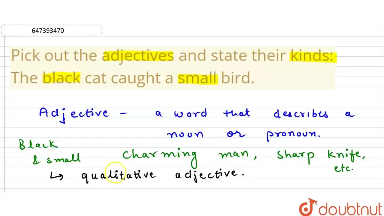 Pick out the adjectives and state their kinds The black cat caught a