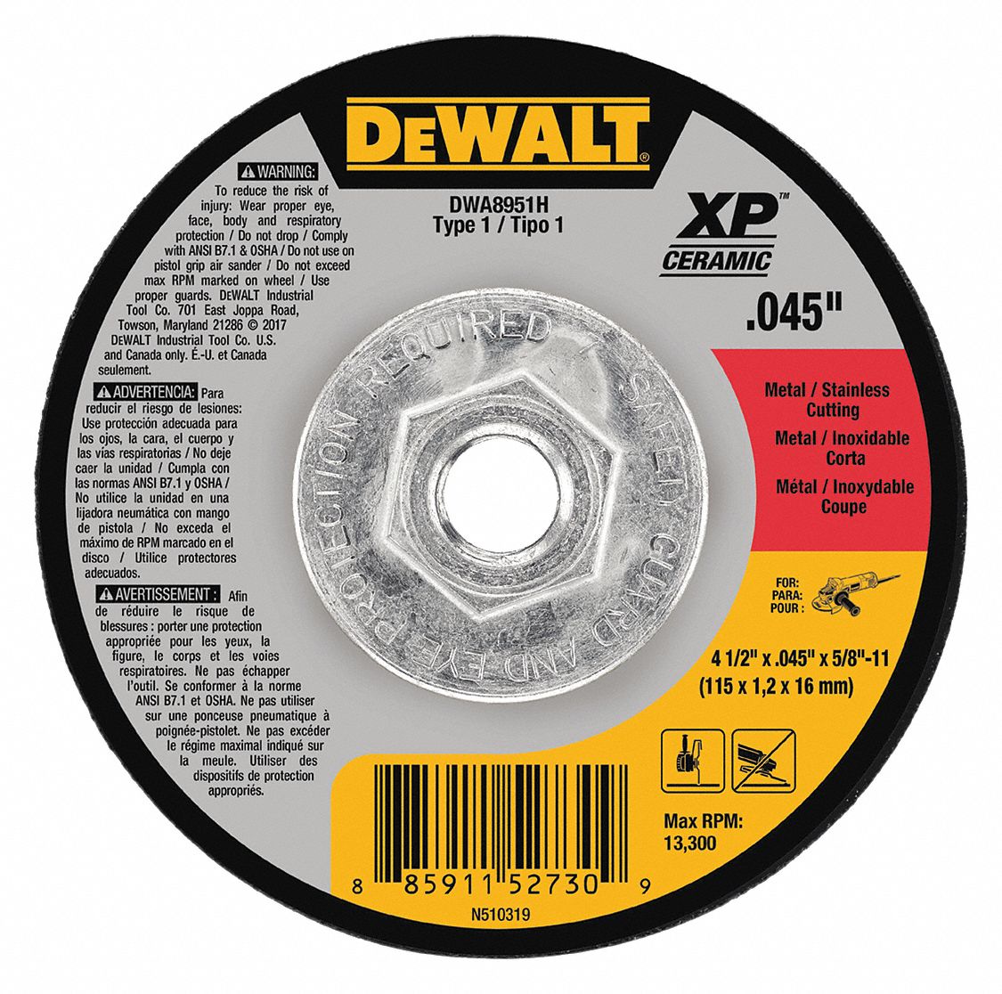 DEWALT 4 1/2 in, Type 1 Ceramic Abrasive CutOff Wheel, 5/8"11 Arbor