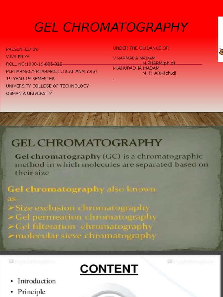 Chromatography An Overview • Microbe Online Gel Chromatography Content Gel filtration chromatography is a type of chromatography that separates components based on their molecular sizes using porous gel beads of a particular porosity. Principle of gel permeation chromatography. Gel filtration is a technique in which the separation of components is based on the difference in molecular weight or size. For lipophilic substances he has contributed considerably to the transition. Gel Chromatography Content.