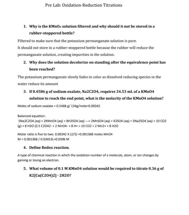 Solved Pre Lab OxidationReduction Titrations 1. Why is the