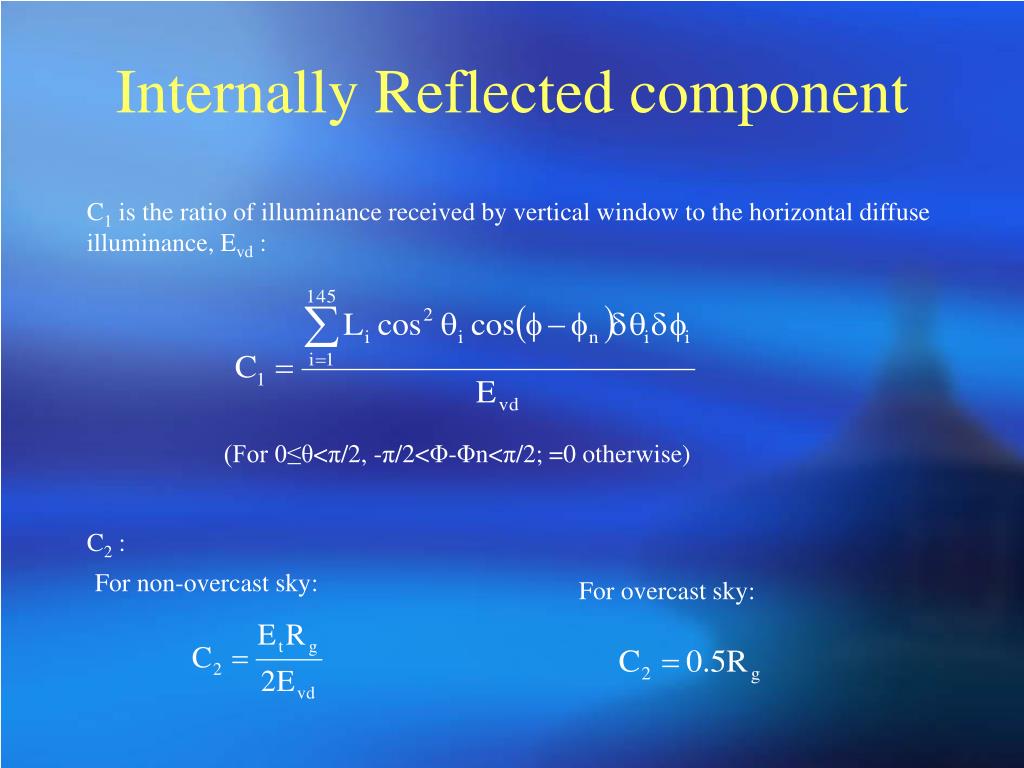 PPT Enhancing Energy Efficiency of Built Environment through External Reflected Component An externally reflected component (erc) is modified by: The df is divided into three components; Luminance of the sky it would have hit reflectance of the material assigned to the. The externally reflected component is influenced due to surface reflectance of the surroundings as the ground and external. Sky component (sc), external reflected component (erc) and internal reflected component (irc).. External Reflected Component.