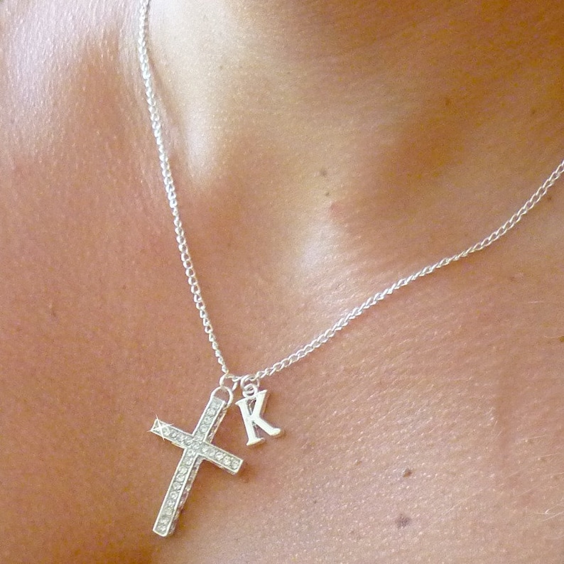 Large Cross Necklace With Crystals and Letter Charm in Gift Etsy