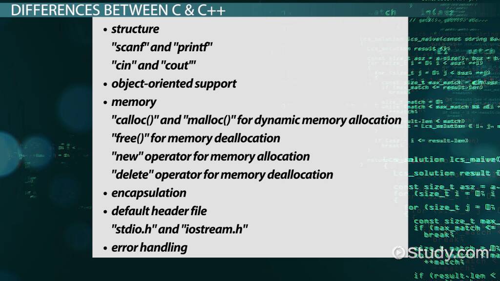 Differences Between the C C++ Languages Video Lesson Transcript C++ C Difference Main differences between c and c++. In this tutorial, we have explored the main differences between c vs c++ languages in terms of various features. C++ is a direct descendant of c that retains almost all of c as a subset. Other differences include more sophisticated memory management with c++, the. The file extension for a file that contains c. C++ C Difference.