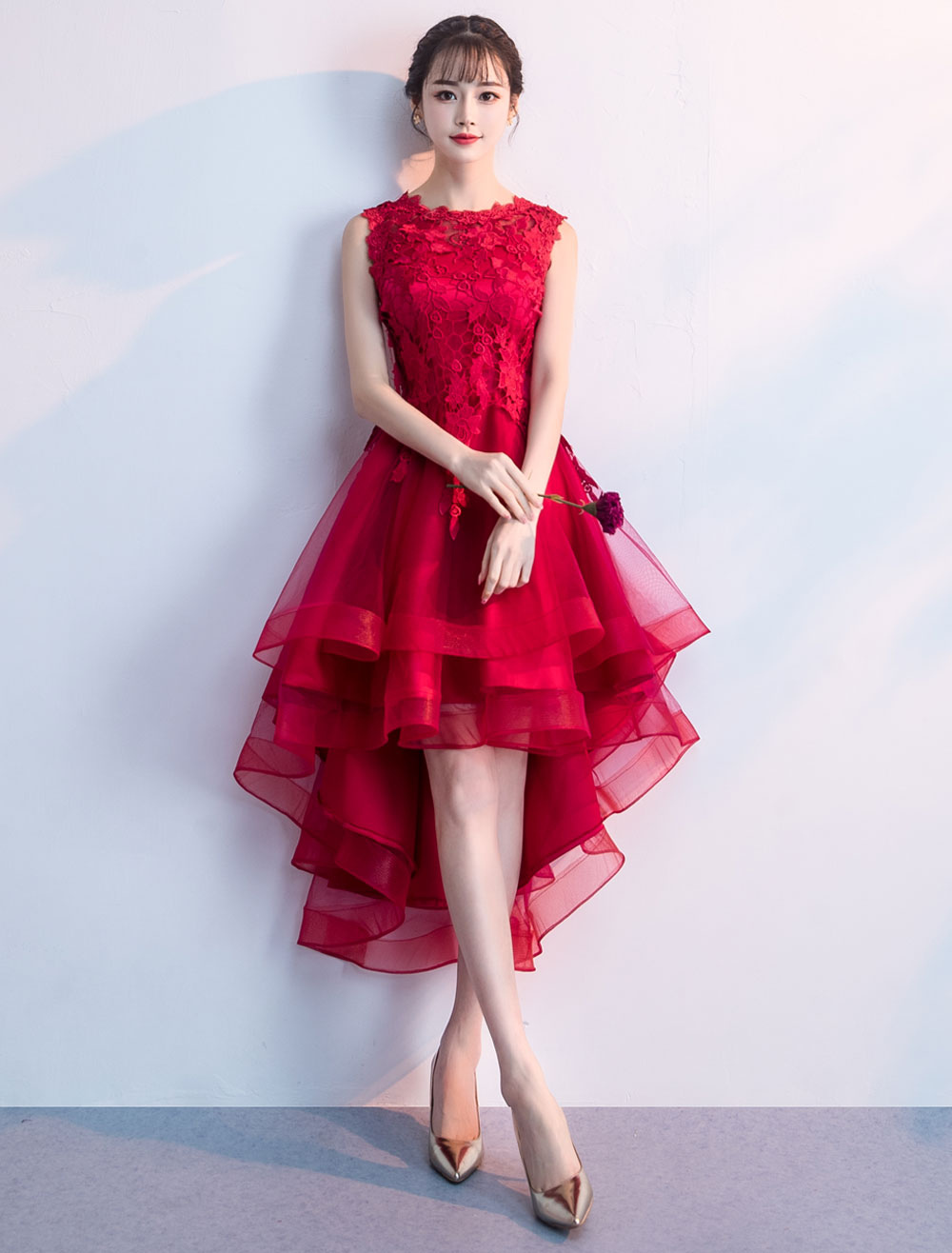 Cocktail Party Dresses Red High Low Prom Dress Lace Applique
