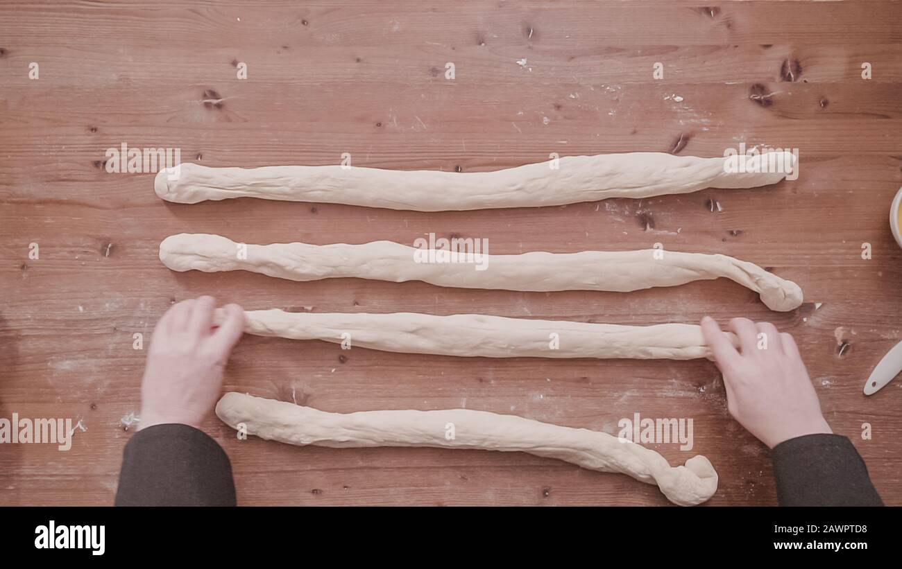 Flat lay. Step by step. Brading dough to bake fresh challah bread Stock