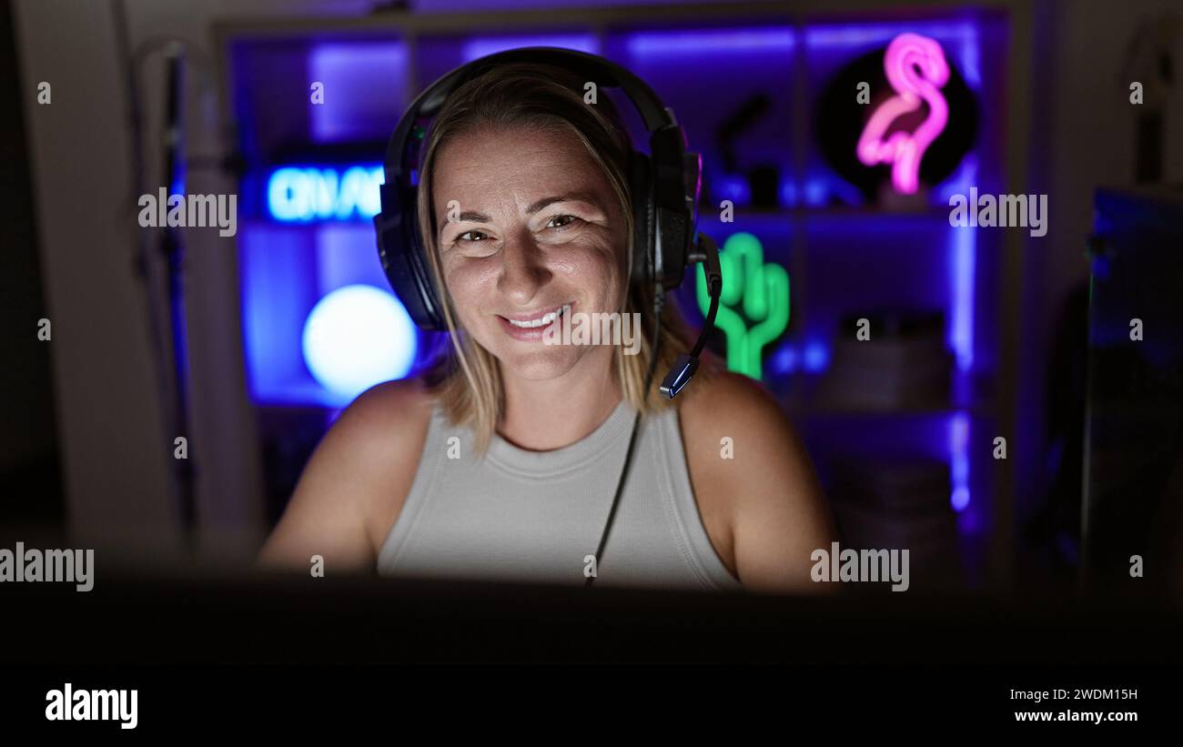 Smiling young blonde streamer confidently streaming game night on her computer. this beauitiful