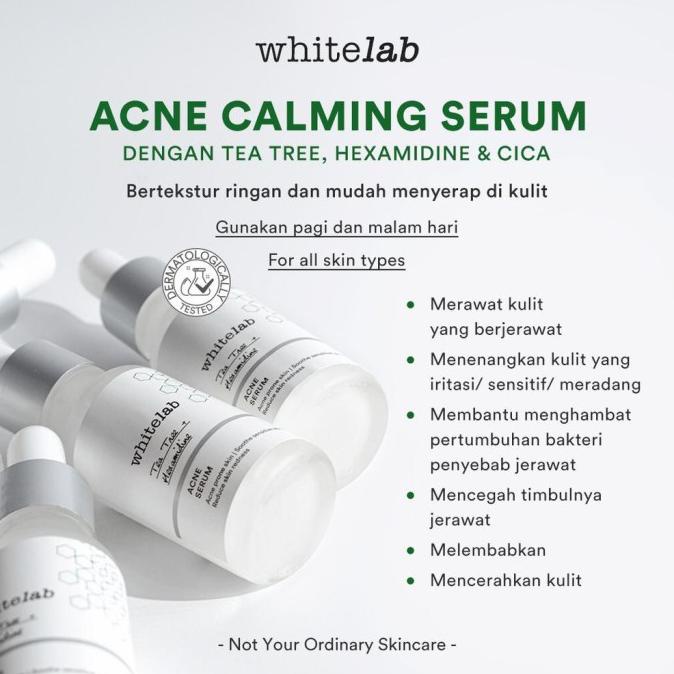 Whitelab Acne Calming Serum Whitelab Acne Calming Serum Whitelab acne calming serum (new formula) is a product with 24 ingredients. Whitelab acne calming serum diformulasikan dengan kekuatan 3 kandungan utama mugwort 5%, bha, dan tea tree yang dapat membantu. Whitelab acne calming serum diperkaya dengan tea tree & centella asiatica yang bermanfaat untuk menenangkan kulit yang. Diformulasikan dengan kekuatan 3 kandungan utama mugwort 5%, bha, dan tea tree. Whitelab Acne Calming Serum.