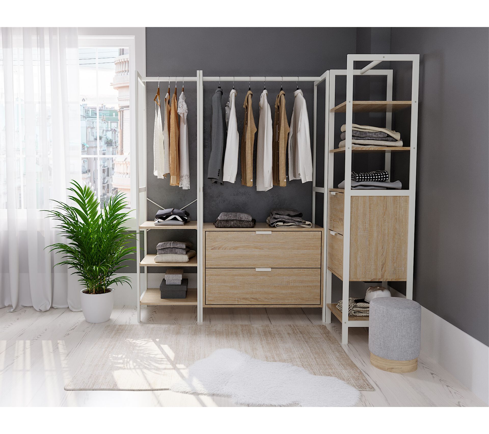 Dressing ouvert, modulable avec 2 autres éléments SHELVA blanc et imitation chêne Kit dressing BUT