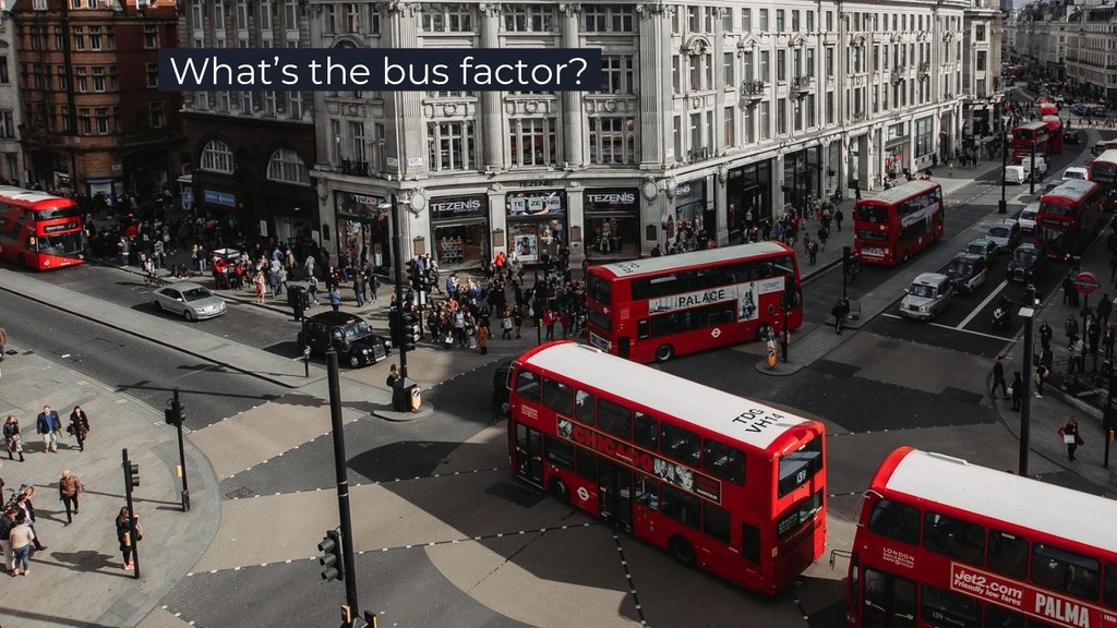 Two things I learned at NDC Oslo 2014 Coffee break builds and the bus The Bus Factor Bus factor is a metric that identifies how resilient is the project to the sudden engineer turnover. What is the bus factor? In the world of business, the bus factor is a rather grim metaphor that paints a picture of your key team member getting hit by a bus. These days many project leads talk about the bus factor, the. The Bus Factor.