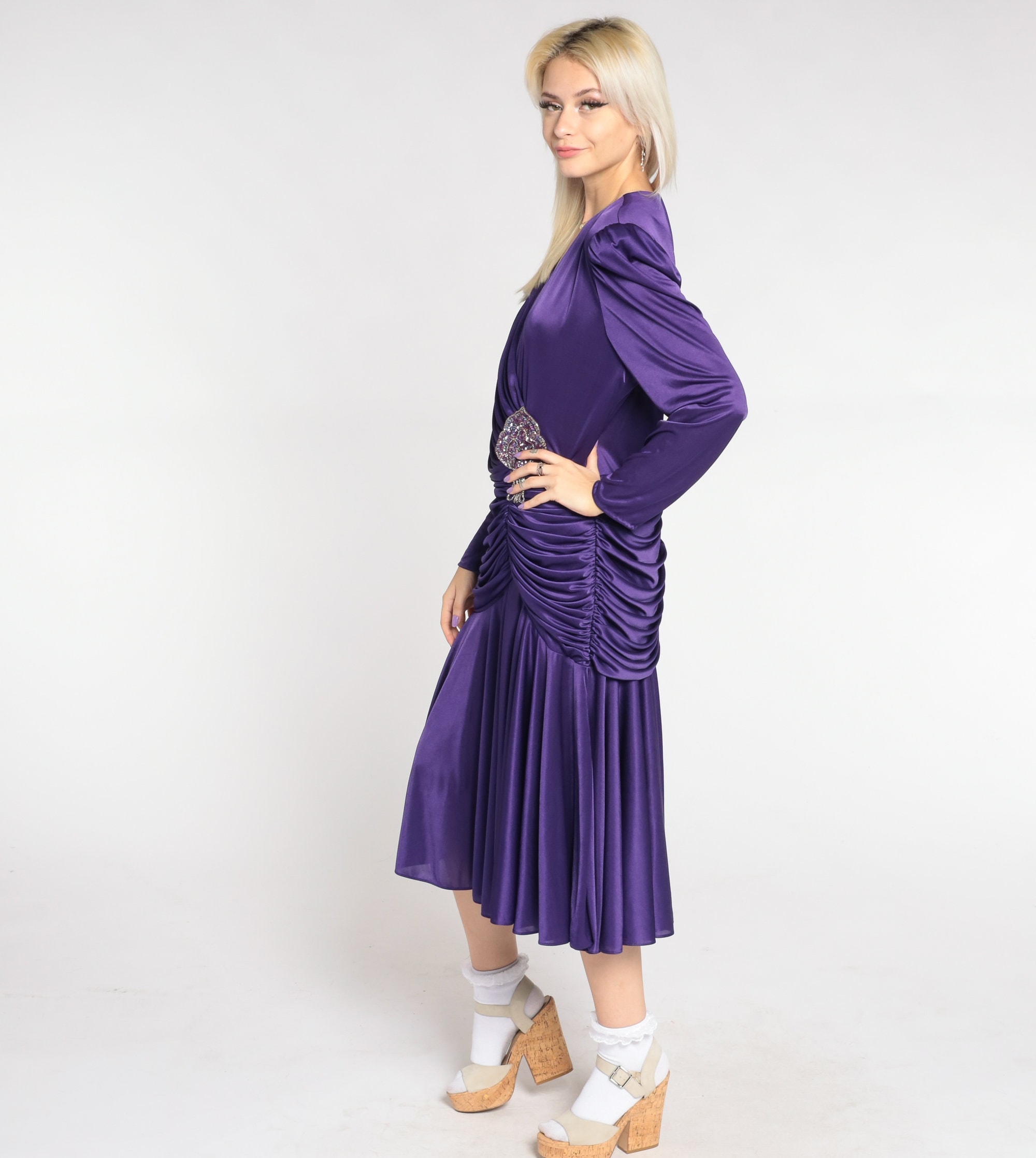 Purple Party Dress 80s Draped Midi Dress Formal Long Puff Sleeve Sequin