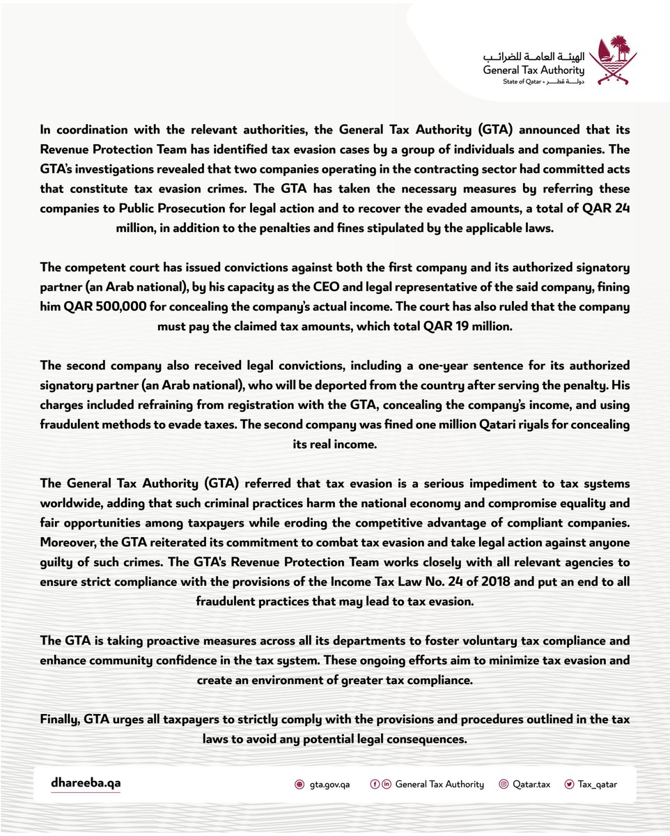 General Tax Authority الهيئة العامة للضرائب on Twitter "بيان الهيئة Tax Evasion Qatar the qatar tax law no. 24 of 2018 stipulates financial penalties and sanctions for fraudulent acts resulting in. the general tax authority (gta) referred that tax evasion is a serious impediment to tax systems worldwide, adding that such. the authorities stated that tax evasion is a serious impediment to tax systems worldwide, adding that such. the. Tax Evasion Qatar.