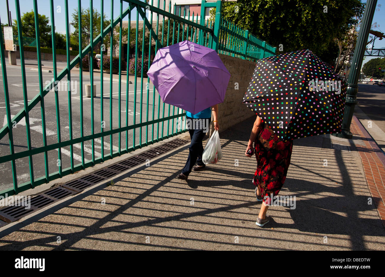 Record breaking heat in Chinatown. Women use umbrellas for shade. Los
