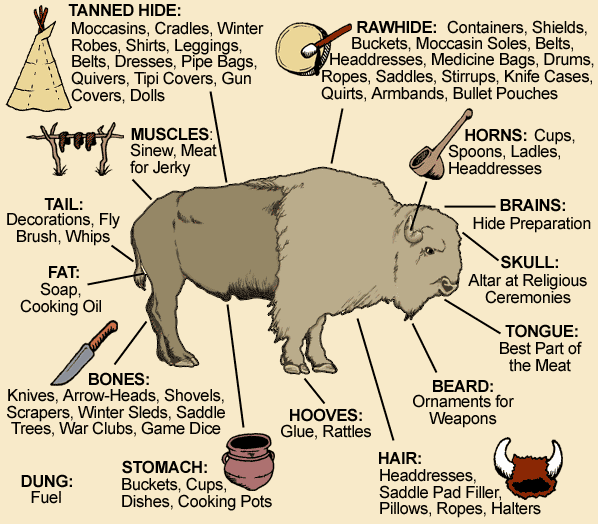 Bison hides were used for just about everything—moccasins, pouches, tipi coverings, clothing, and even disguises to help hunt more bison. Both of these chippedstone tools probably were used in acquiring and processing the hides of bison. Hides from which the hair had been removed (called flint hides) were superb for making the soles of boots and industrial belts. The rugged strength and durability of bison hides made them capable of resisting the elements like no other leather or material of the time. In the early 1870s, a cheap commercial process for tanning bison hides was developed in england and germany. Many of the indian tanned hides were illuminated on the leather side with outline sketches in strong colors, especially bright reds, yellows and. Indigenous peoples used bison meat and fat for food; Hides for clothing, footwear and covering for their lodges; And other parts of the bison for rope, thread, glue or.