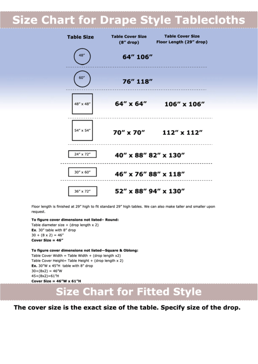 Tablecloths Size Chart By taking the time to major a table by using the charts below, you will be able to determine exactly what size tablecloth and overlays that you need to deck out your tables in a fashionable style that looks neat, clean, and organized. Use your measurements and preferred drop length to calculate the tablecloth size that would be perfect for. Tablecloths Size Chart.