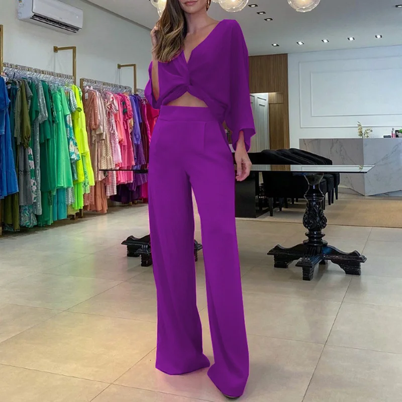 Elegant 2023 Bat Sleeve Deep V neck Crop Top+High Waist Long Pants
