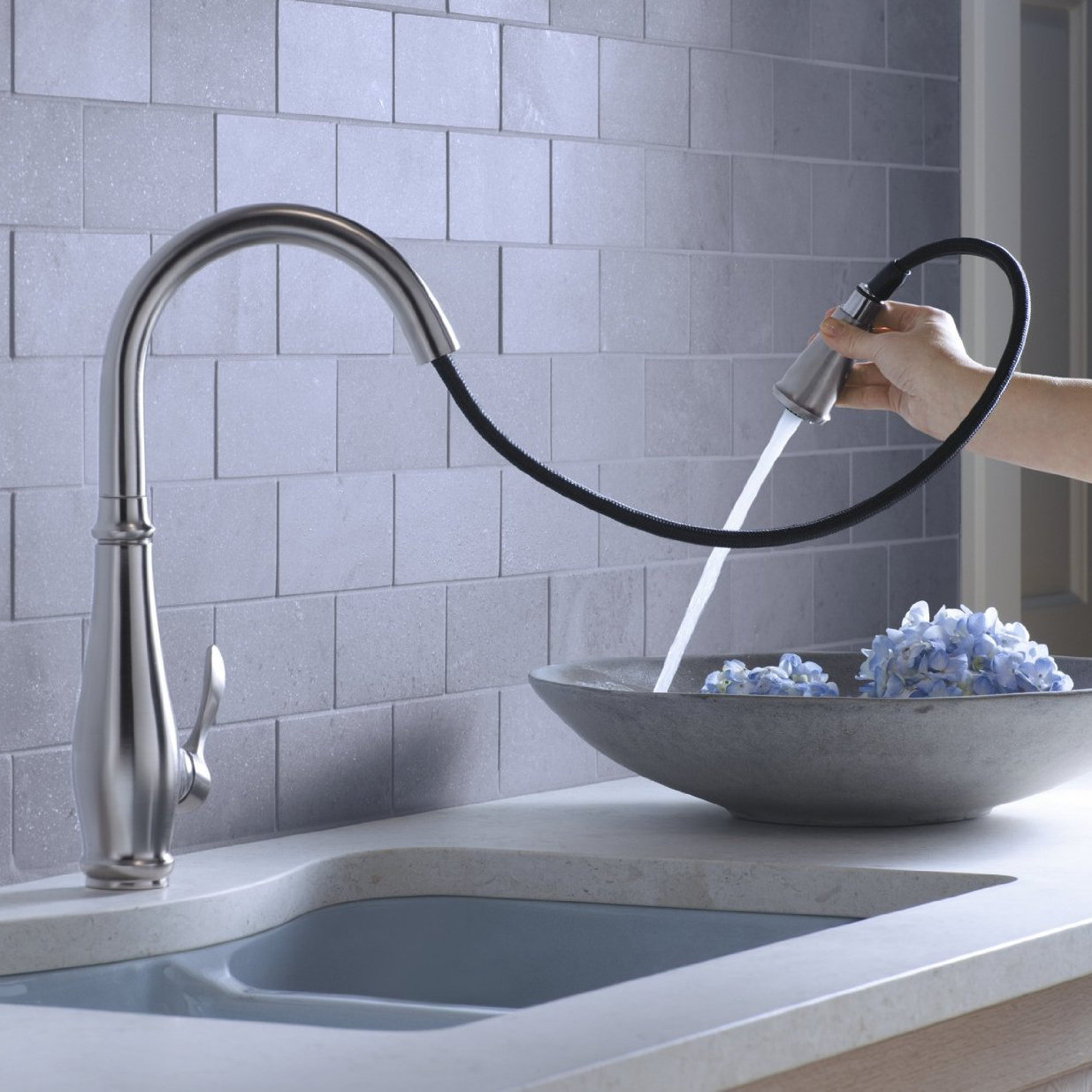 Kitchen Faucet With Sprayer Kohler Inspired by the design of professional kitchens, the sous pull out kitchen faucet will bring to life your inner chef. Inspired by the design of professional kitchens, the sous pull out kitchen faucet will bring to life your inner chef.