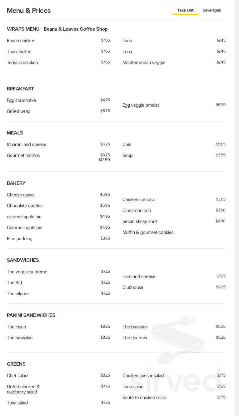 Menu Abbotsford BC's Beans & Leaves Sirved