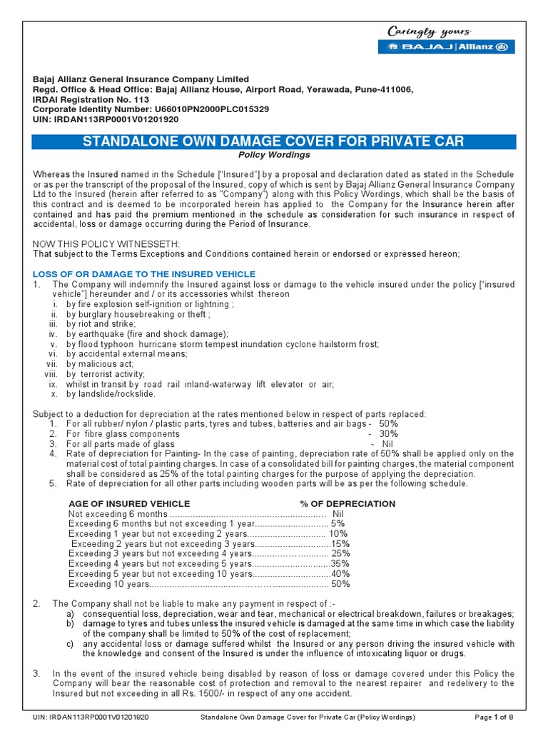 Policy Wordings Standalone OD Cover For Private Car PDF Insurance