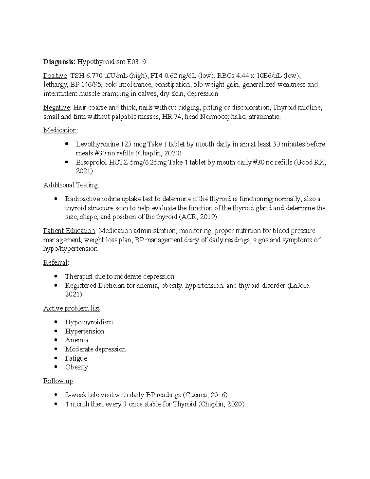 Case Study 2 part 2 Diagnosis Hypothyroidism E03. 9 Positive TSH 6